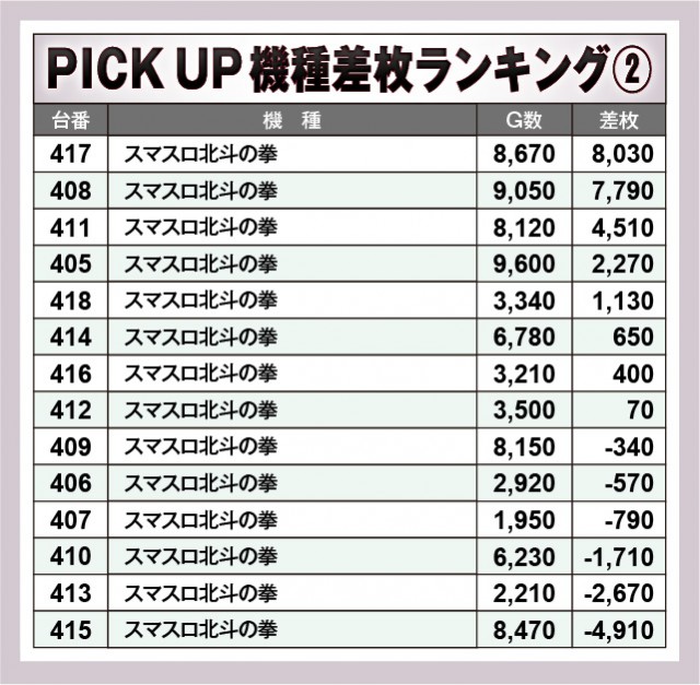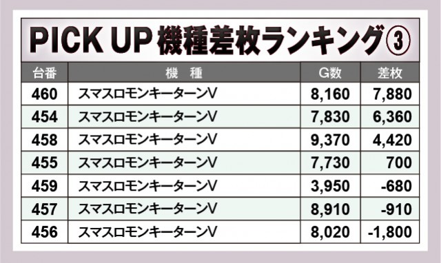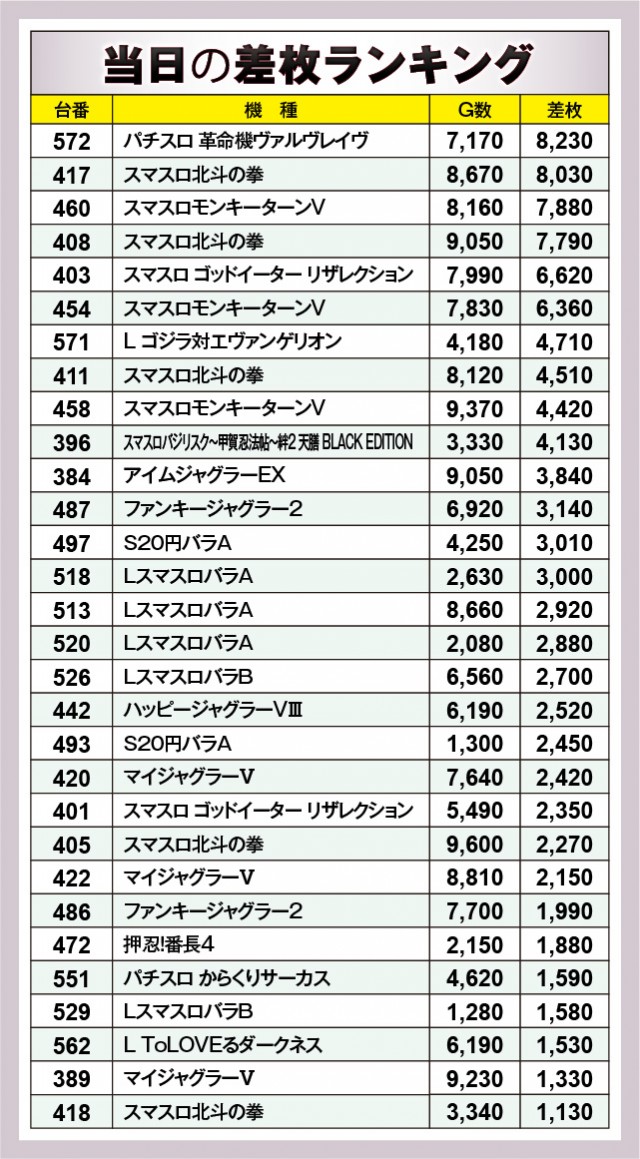 『スマスロ ゴッドイーター リザレクション』『スマスロ北斗の拳』『スマスロモンキーターンV』の3機種はいずれも大台突破台を確認でき、半数以上でプラス差枚数をマークしているのも特徴的だ。8~9,000回転を記録した台もあり、終日を通して打ち込まれた事実から、相当な手応えを感じていたのは間違いない。ファンは有意義な時間を過ごせたことにより、同店の魅力に触れられたのは大きな収穫と言える。