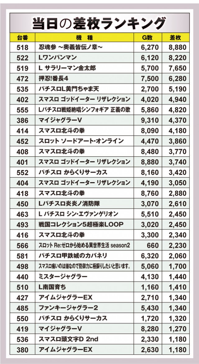 さて、今回の差枚数ランキングを見ていくとしよう。ランキングトップを飾るのはなんと『忍魂参 ~奥義皆伝ノ章~』だ。518番台から8,880枚が飛び出ており、意外な機種から抜群の結果となった。