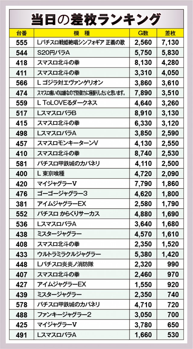 『Lパチスロ戦姫絶唱シンフォギア 正義の歌』にて7,000枚OVERの熱気が飛び出し、当日の店内の盛り上がりをリードする存在に。そして『スマスロ北斗の拳』の名前が多く名を連ねている点も見逃せず、今なお現役で活躍する名機の存在は、ファンの注目を浴びていたことだろう。『ジャグラー』シリーズもコンスタントに大当りを重ねており、館内には笑顔を浮かべるファンの姿が見られた。