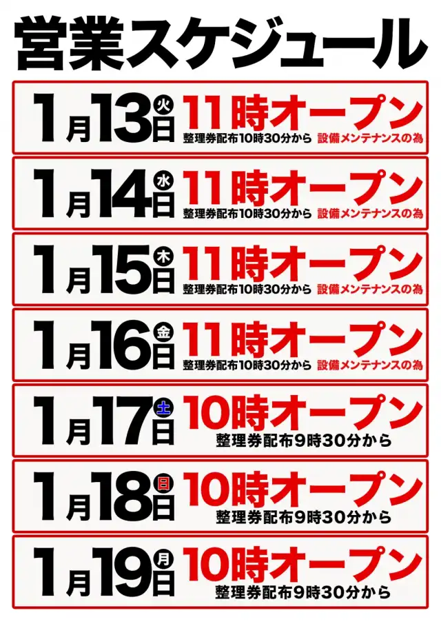 1月15日(木)11時開店 【設備メンテナンスの為】必ずご来店くださいませ。
