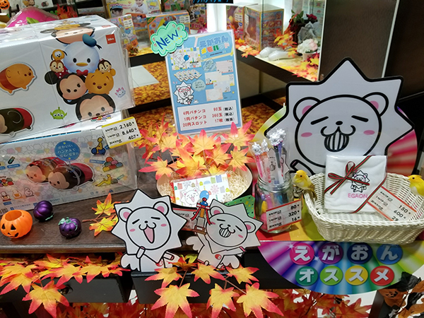 同店の景品コーナーには、同グループのマスコットキャラ“えがおん”のグッズが用意され、プレイヤーたちの目を引いていた。