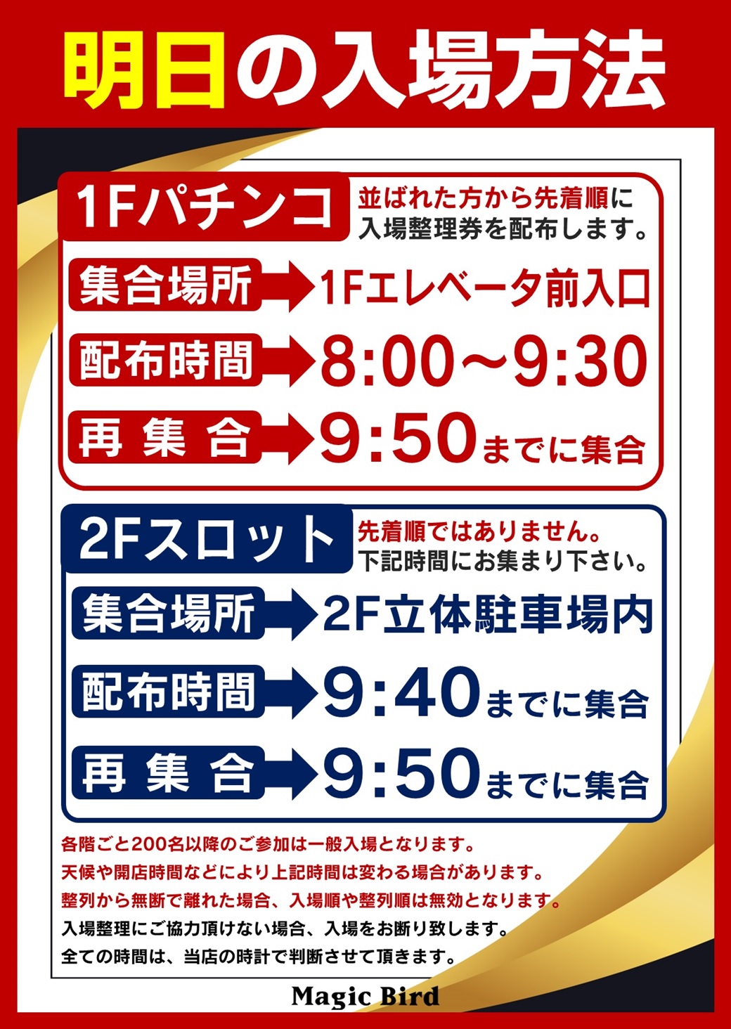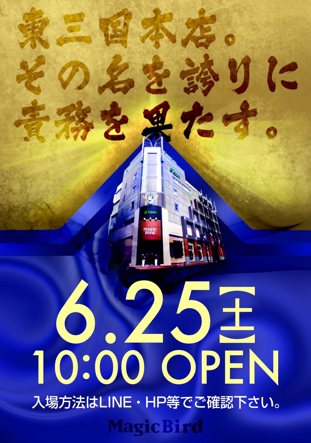 今月でグランドオープンより27周年を迎えることができました今後も皆様に愛される店舗になれますよう精一杯努めて参ります。マジックバード東三国 店長明日6月25日【土】新装の週末到来全館10時オープン◇入場方法のご案内◇≪パチンコ≫並ばれた方から先着順に入場整理券を配布します集合場所⇒ 1Fエレベータ前入口配布時間⇒8:00~9:30再集合⇒ 9:50までに集合≪スロット≫先着順ではございません下記時間にお集まり下さい集合場所⇒ 2F立体駐車場内配布時間⇒ 9:40までに集合再集合⇒ 9:50までに集合◆こちらにもご注目◆[マジックバード本店][マジックスクエア]多数様のご来店スタッフ一同お待ちしてます