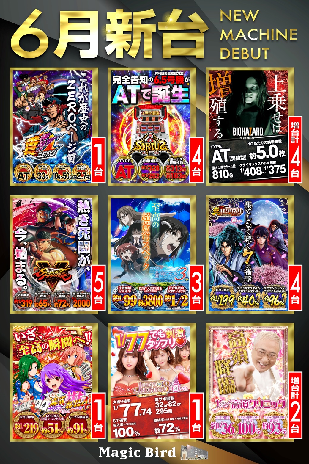 今月でグランドオープンより27周年を迎えることができました今後も皆様に愛される店舗になれますよう精一杯努めて参ります。マジックバード東三国 店長新装週末到来週末に羽を伸ばすならマジックバードへ<スロット>シリウス押忍!番長ZEROパチスロ バイオハザード7レジデント イービル(増台)<パチンコ>PストリートファイターVPF蒼穹のファフナー3 EXODUS超蒼穹3800ver.P真バジリスク~甲賀忍法帖~P麻雀物語4PA激デジジューシーハニー3Pyes!高須クリニック~超整形BLACK~(増台)