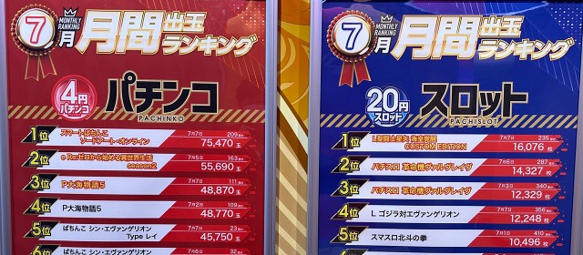 そこに続いたのが『スマスロ痛いのは嫌なので防御力に極振りしたいと思います。』の+7,200枚超、『Lパチスロ戦姫絶唱シンフォギア 正義の歌』の+7,100枚超、『スマスロ北斗の拳』が+6,100枚超、『L ゴジラ対エヴァンゲリオン』では+5,000枚弱&+3,400枚弱が1台ずつ、『マイジャグラーⅤ』が+3,500枚超と、ハイスコアが続々と飛び出した。