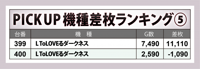 その中では『L ToLOVEるダークネス』399番台が+11,100枚オーバーで全台の頂点に輝いた。