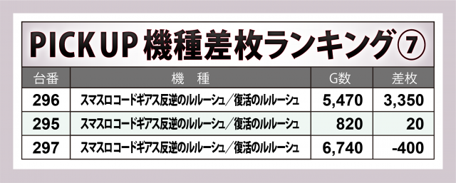 最初は1,000overとなった上位30台から見ていこう。30台のうち19台が+2,000枚以上となった他、+3,000枚以上は12台、+4,000枚オーバーは6台、+6,000枚オーバーは5台、+7,000枚オーバーは3台、そして万枚突破台は1台と、上位陣の差枚数はハイレベルだった。