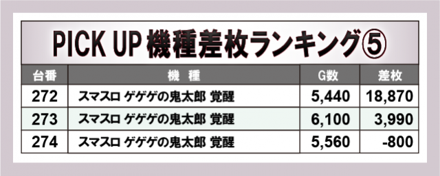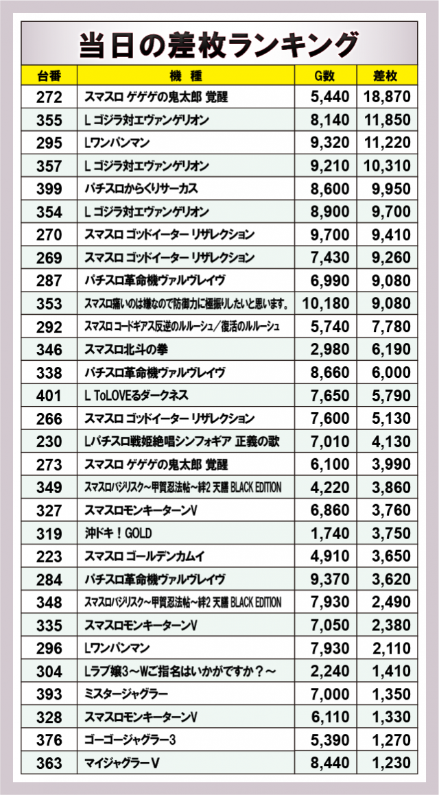 人気のスマスロ機を筆頭に叩きがいのある状況が整っており、突出していたのが『スマスロ ゲゲゲの鬼太郎 覚醒』『L ゴジラ対エヴァンゲリオン』『Lワンパンマン』で、これらから万枚OVERが発生しており、同機種たちの可能性を窺える結果となっている。なかでも『スマスロ ゲゲゲの鬼太郎 覚醒』ではコンプリート達成が見られ、他を圧倒する熱量を披露していたと言える。