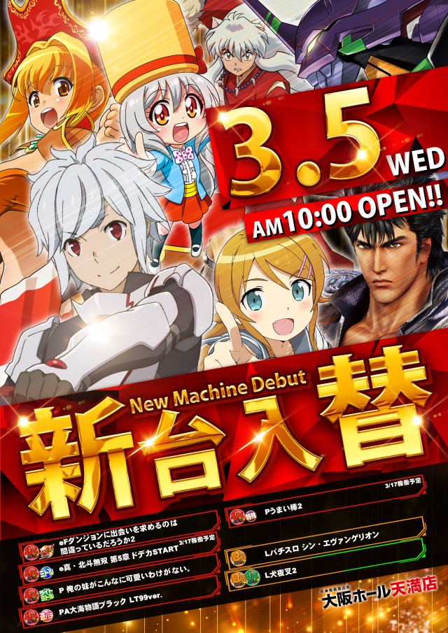 大阪ホール天満 新台入替(予定) 46枚貸し再始動!!