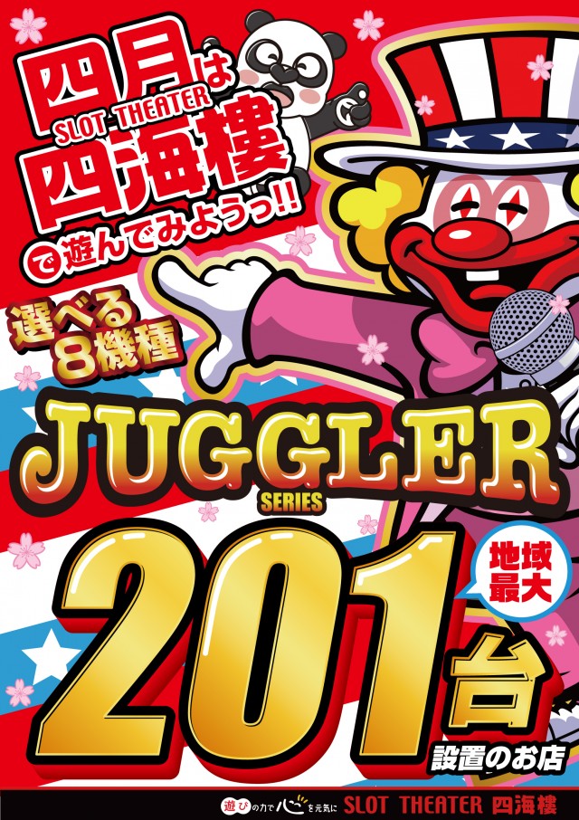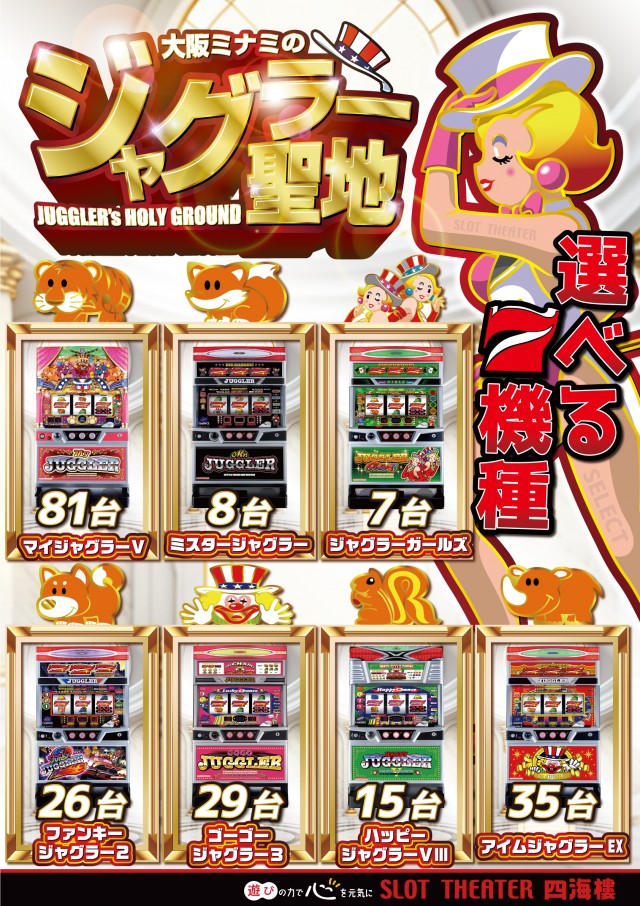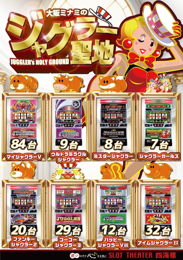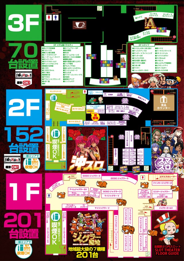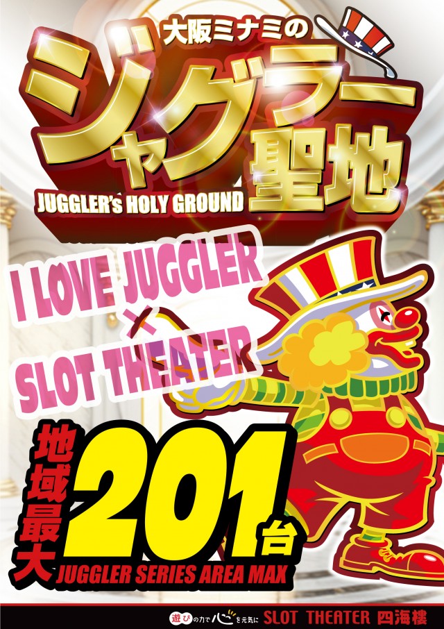 1階はジャグラーシリーズ関西最大級専門フロアで173台設置!2階は最新&定番機種や沖スロ設置。賞品カウンターも2階にございます。3階はバラエティ♪ジャグラーを愛して24年♪1998年創業の老舗スロット専門店です。