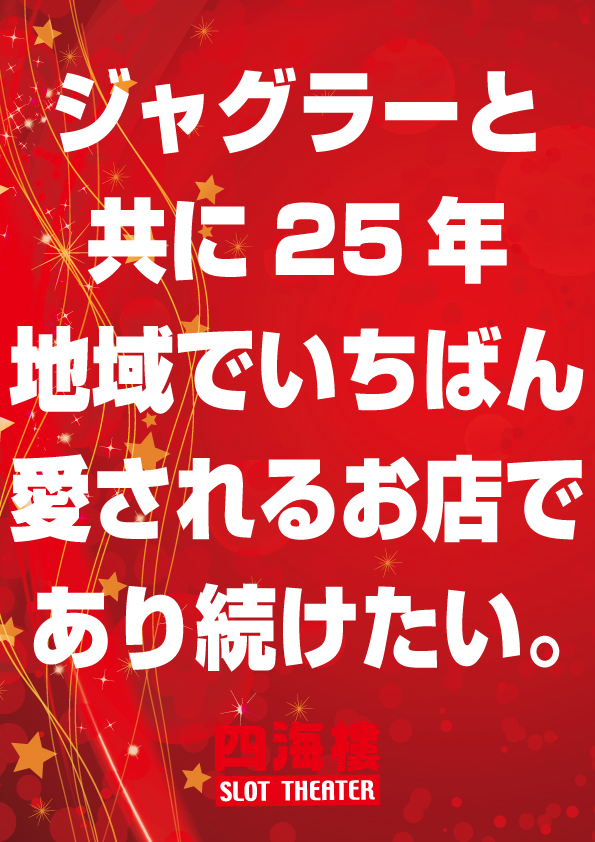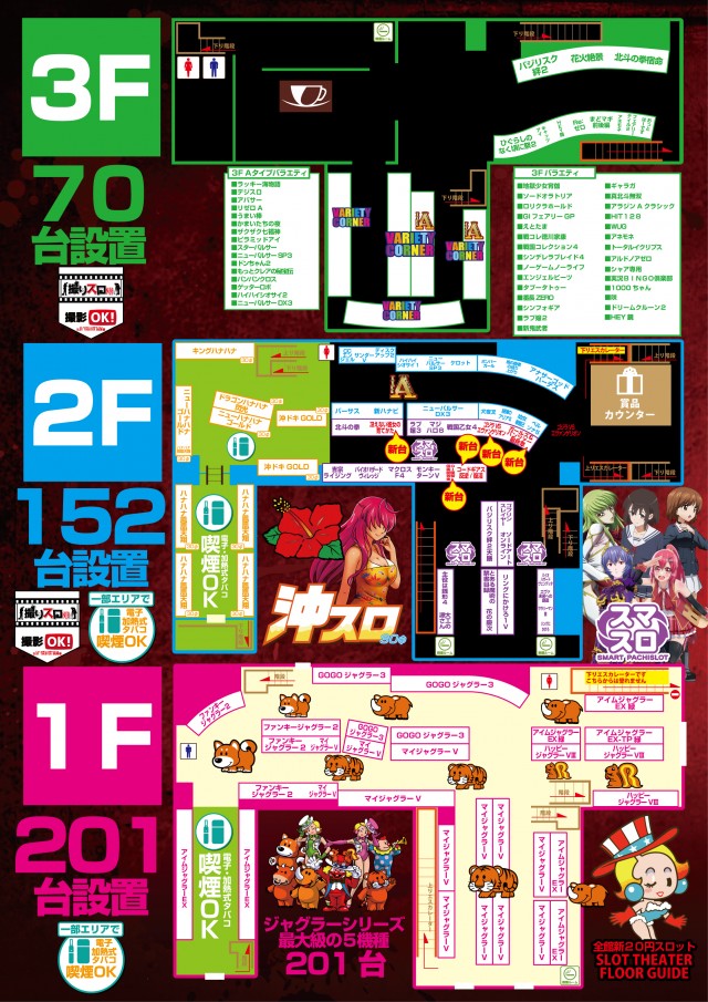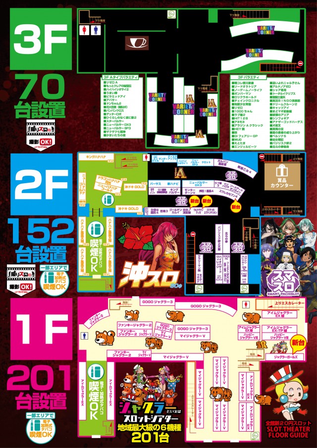 1階はジャグラーシリーズ関西最大級専門フロアで173台設置!2階は最新&定番機種や沖スロ設置。賞品カウンターも2階にございます。3階はバラエティ♪ジャグラーを愛して24年♪1998年創業の老舗スロット専門店です。