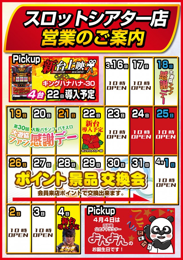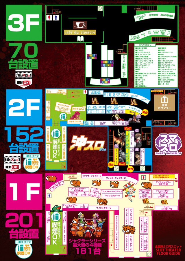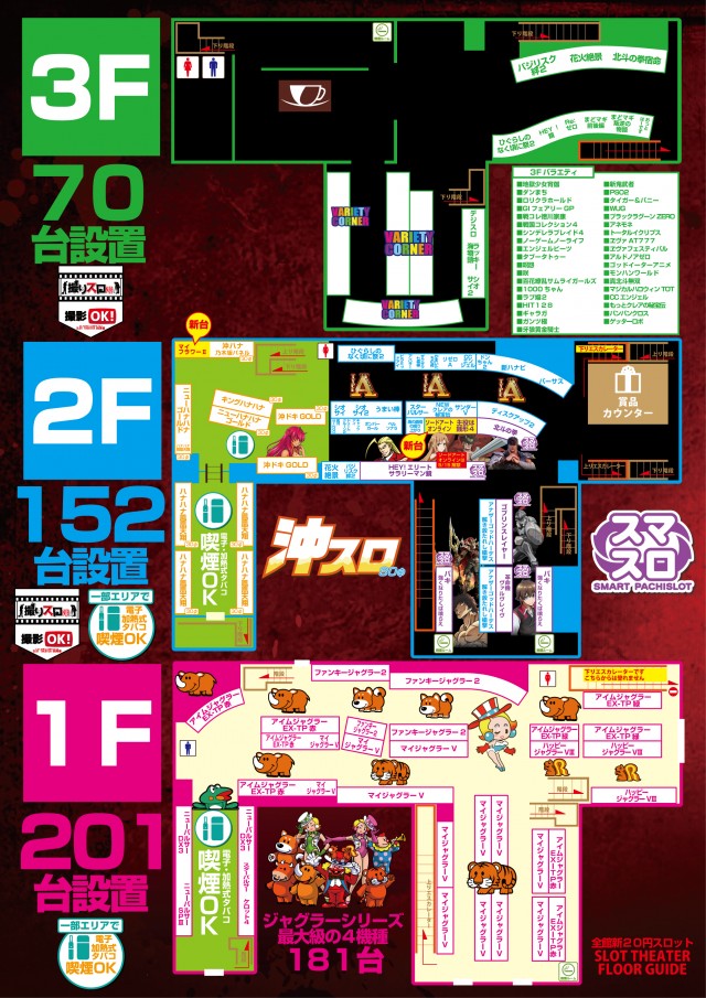 1階はジャグラーシリーズ関西最大級専門フロアで173台設置!2階は最新&定番機種や沖スロ設置。賞品カウンターも2階にございます。3階はバラエティ♪ジャグラーを愛して24年♪1998年創業の老舗スロット専門店です。