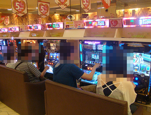 座席に2人用ソファが設置されている5円パチスロにも、にこやかな表情のプレイヤーを確認。隣の人と楽しさを共有しつつ、遊技をおこなっているといったシーンもみられた。