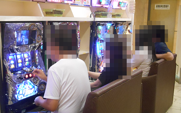 2人がけのソファが設置されている5円パチスロにもプレイヤーの姿があり、朝イチからにぎやかな空間が広がっていた。