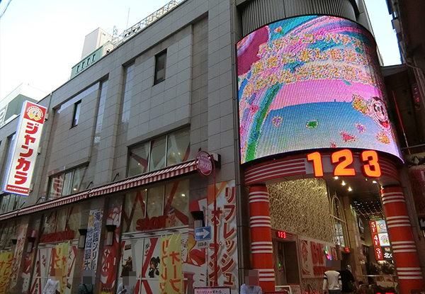 遠くからでもわかるような華やかな外装と大きなモニターが目をひくホールだ。