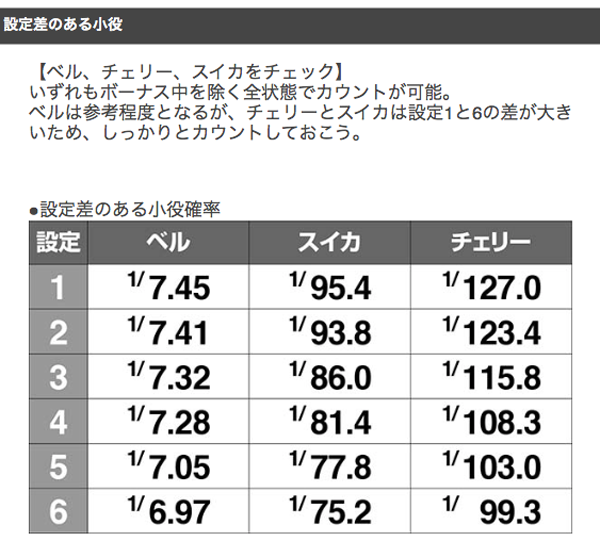 スイカやチェリー、ベルなどの小役確率にも設定差があるため、実戦時はしっかりとカウントしておきたい。