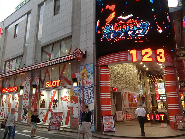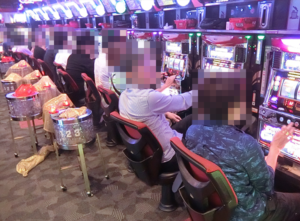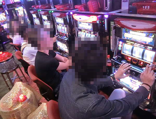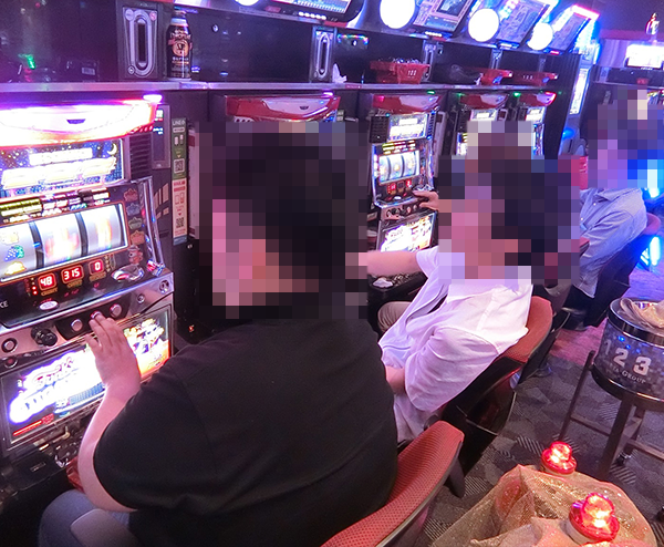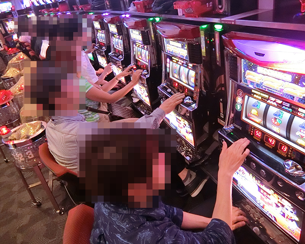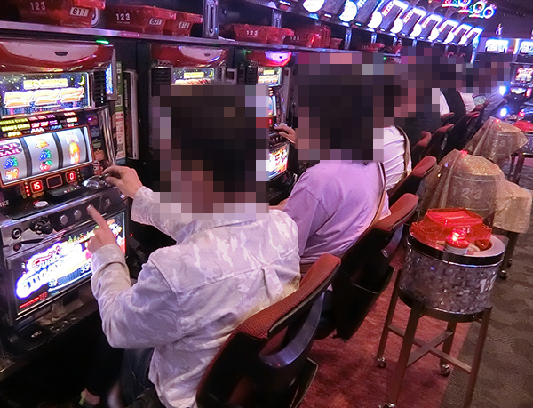 ホール全体に輝くような笑顔が広がっていた「123難波店」。「ファンキージャグラー」のみならず、さまざまな機種でプレイヤーが活躍していた。
