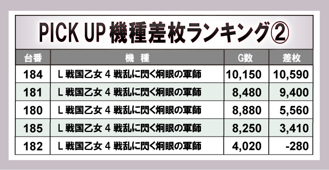 『L ToLOVEるダークネス』『L戦国乙女4 戦乱に閃く炯眼の軍師』から万枚OVERをマーク!それに加えて万回転OVERが飛び出しているのも印象的で、当日の店内の盛り上がりを牽引する存在となっていた。このほかにも大台突破台が多数記録し、打ちごたえのある状況でファンが歓喜しており、有意義な時間を過ごしていたのは確かだろう。