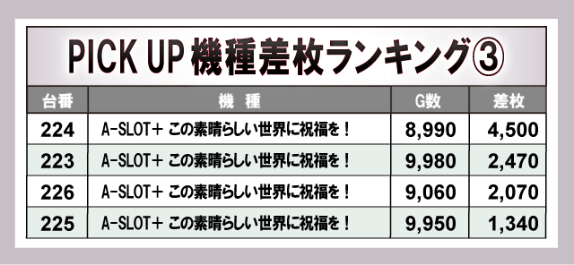 『L ToLOVEるダークネス』『L戦国乙女4 戦乱に閃く炯眼の軍師』万枚OVERなどが目に飛び込むが、『A-SLOT+ この素晴らしい世界に祝福を!』『スマスロ痛いのは嫌なので防御力に極振りしたいと思います。』は全台プラス差枚数を達成。他にも大台突破台を確認でき、優秀機種から盛り上がりが発生していた様子が窺える。