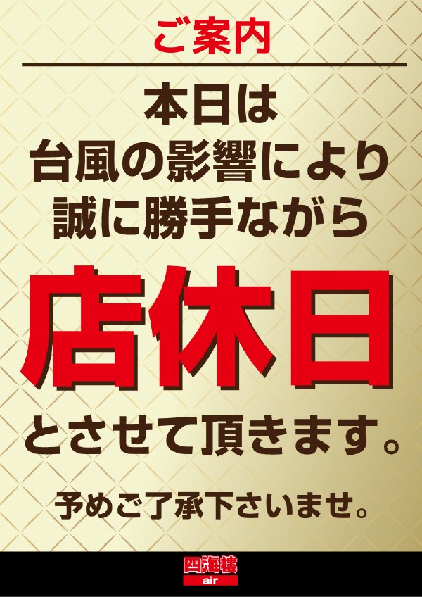本日は誠に勝手ではございますが、台風の影響により店休日とさせて頂きます。ご迷惑をお掛けしますが、予めご了承下さい。