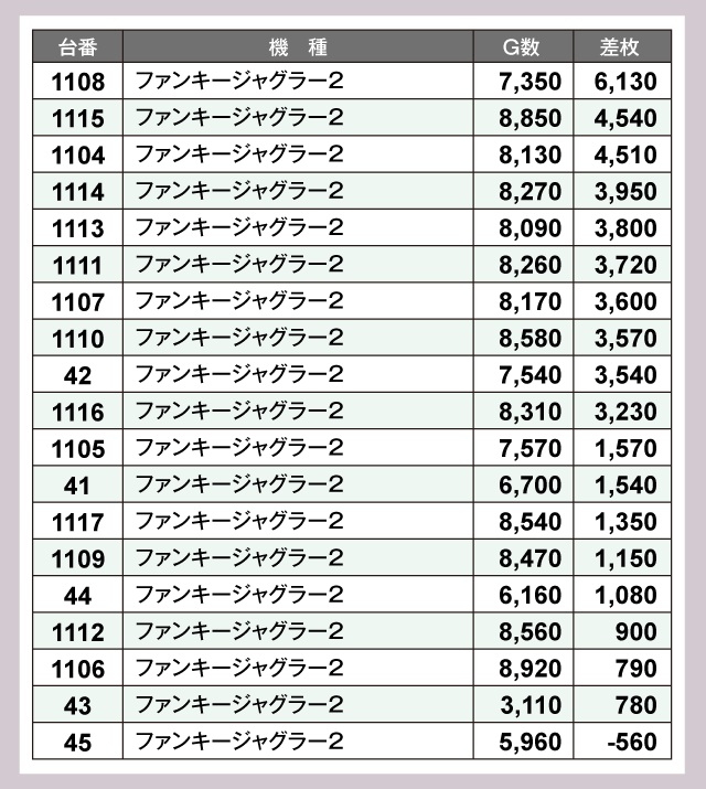 その他にも、Aタイプ機種では『ファンキージャグラー2』が大奮闘しており、1108番台の+6,130枚を筆頭に全19台中18台がプラス差枚となる圧巻の結果に。また、導入直後の新台『プリズムナナ』からも+5,590枚が飛び出しており、新旧を問わず広範囲に渡ってチャンスが潜んでいたのは間違いだろう。