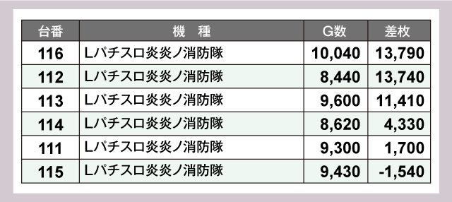 この日は、なんといっても『Lパチスロ炎炎ノ消防隊』がアツかった!! 116番台と112番台が+13,000枚超、113番台が+11,410枚と、夢の大台超えが3台も発生しファンを喜ばせていた。さらに、『パチスロ からくりサーカス』と『パチスロ かぐや様は告らせたい』、『L 東京喰種』も万枚超を達成する盛況ぶりを披露している。