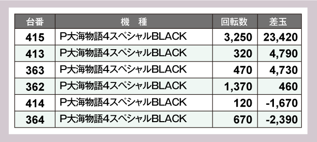 特にプレイヤーの注目を集めていたのが『P大海物語4スペシャルBLACK』で、遊びやすいライトミドルながら+23,420発という驚異的な出玉を叩き出している。