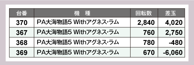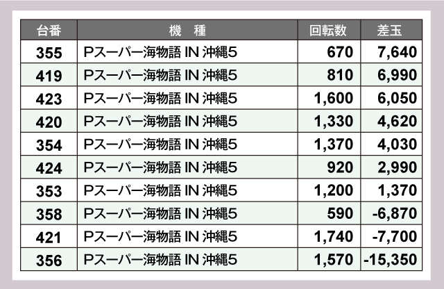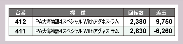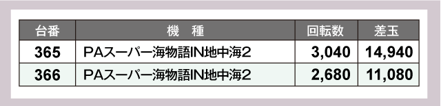 また、2台設置されている甘デジの『PAスーパー海物語IN地中海2』がいずれも万発超、さらに『Pスーパー海物語 IN 沖縄5』も半数以上の台がプラス差玉で終了しているだけに、海物語ファンにとっては充実した一日となったはずだ。