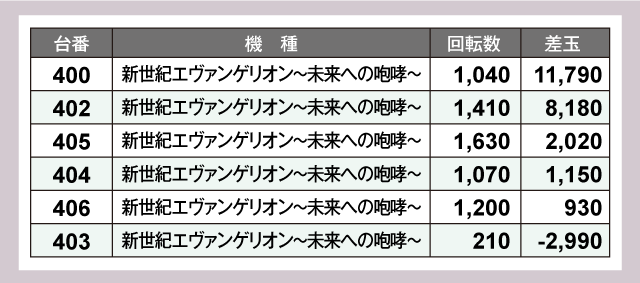 特にプレイヤーの注目を集めていたのが『Pスーパー海物語 IN 沖縄5』で、+16,500発を叩き出す圧巻の記録を樹立。また、『新世紀エヴァンゲリオン〜未来への咆哮〜』からも+11,790発が飛び出している。