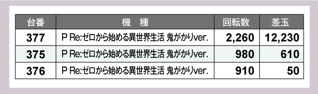 さらに、3台設置されている『P Re:ゼロから始める異世界生活 鬼がかりver.』は全ての台がプラス差玉、なかでも377番台が+12,230発という見事な成績を残しているだけに、シマ内は常に活気に満ち溢れていた。