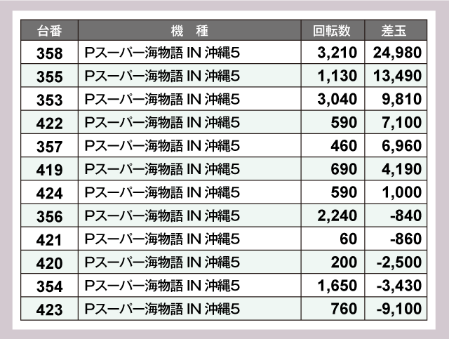 早速、店内状況をチェックしていくと、特に目立っていたのが人気の海物語シリーズ『Pスーパー海物語 IN 沖縄5』で、358番台が+24,980発、355番台が+13,490発といったハイスコアを連発。しかも、半数以上の台がプラス差玉となる見事な結果を残している。
