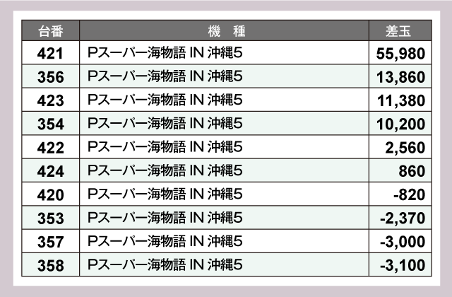 早速、店内状況をチェックしていくと、最もプレイヤーの注目を集めていたのが『Pスーパー海物語 IN 沖縄5』で、421番台が怒涛の+55,980発を記録。さらに、その他にも万発超が3台も発生する盛況ぶりを見せており、シマ内は終日ファンの笑顔と活気に満ち溢れていた。