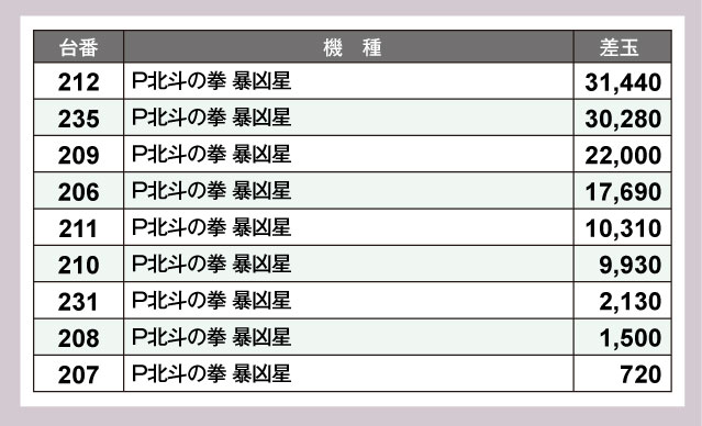 パチンココーナーでは定番機種の『新世紀エヴァンゲリオン〜未来への咆哮〜』と『P北斗の拳 暴凶星』がにぎやかな状況となっていて、それぞれ3万発・4万発クラスが誕生。根強い人気とポテンシャルを発揮していた。