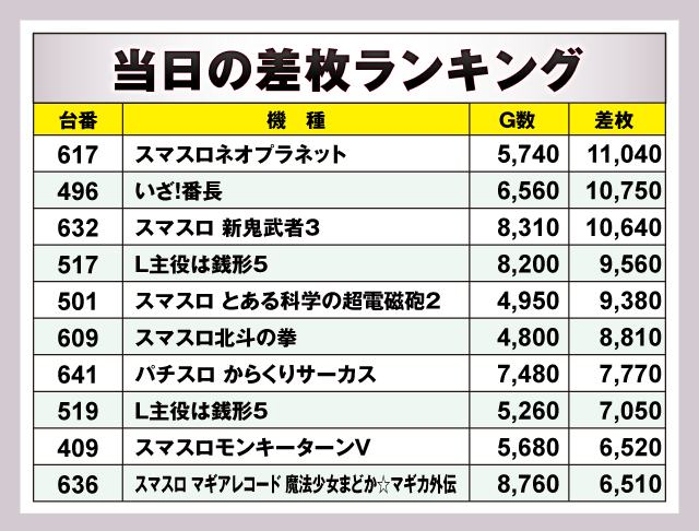 パチスロコーナーで最も目立っていたのは新台の『スマスロネオプラネット』で、11,000枚超のプラスを記録。そのほかにも『いざ!番長』『スマスロ 新鬼武者3』から万枚オーバー台が誕生した。