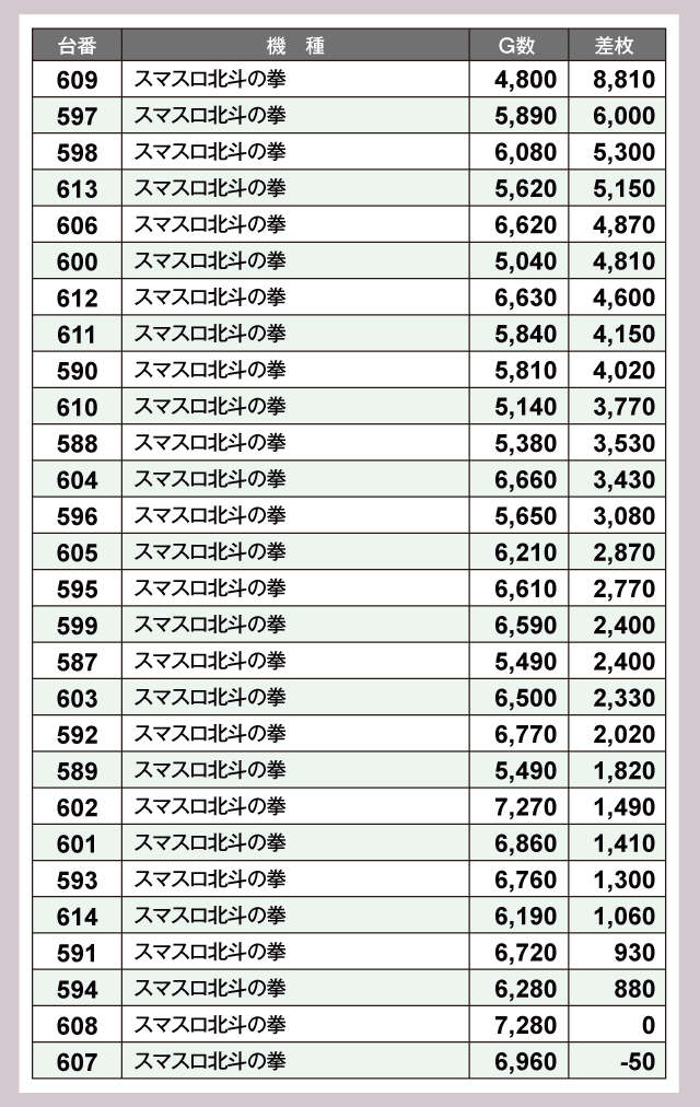 全28台が設置され多くの台が終日高稼働をマークした『スマスロ北斗の拳』で、609番台の+8,800枚超を筆頭に26台がプレイヤーの勝利という驚きの結果を残した。