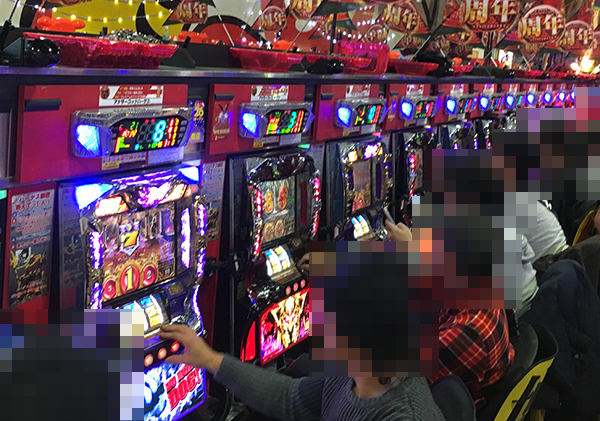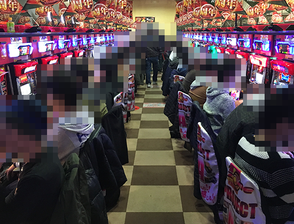 朝イチの20円パチスロは、どの機種もほぼ満席といった状況。