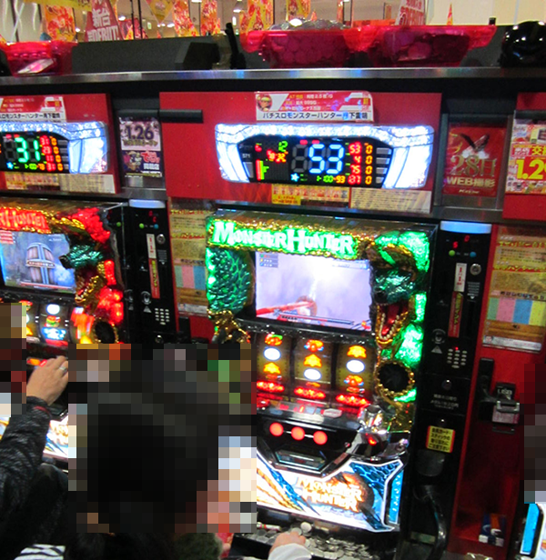 15時頃に20円パチスロの様子をうかがうと、「バジリスク~甲賀忍法帖~絆」や「パチスロ モンスターハンター 月下雷鳴」に機種の性能を最大限まで引き出しているといったプレイヤーを発見。