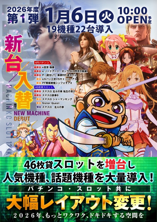2026年1月6日(火) 新台入替&46枚貸スロット増台!!