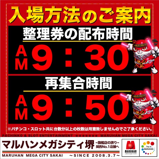 9時30分迄にお並びいただいたお客様に入場抽選にて順番券を配布致します。※新台入替予定日など時間が変動する場合がございます。 |