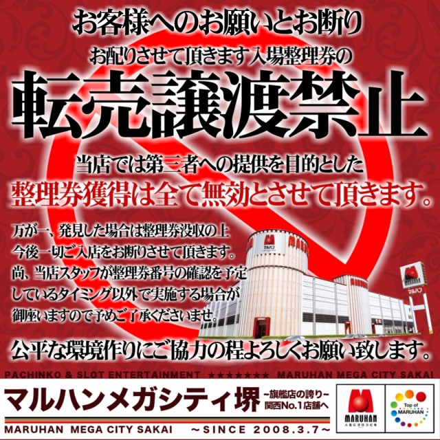 9時30分迄にお並びいただいたお客様に入場抽選にて順番券を配布致します。※新台入替予定日など時間が変動する場合がございます。 |
