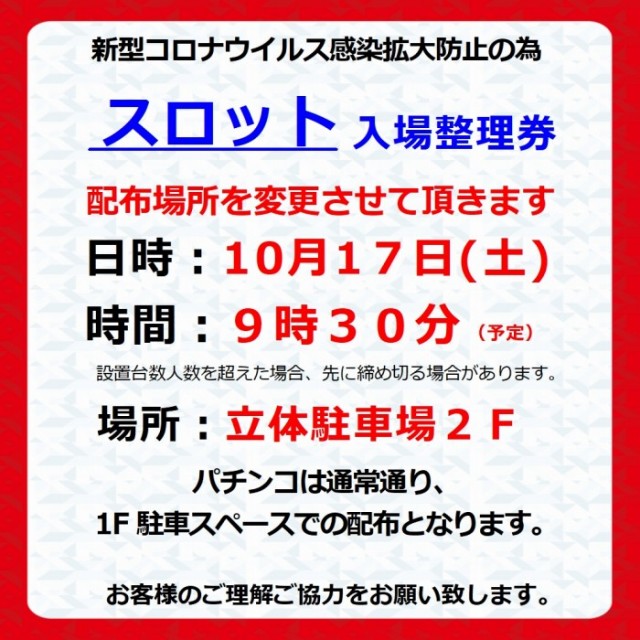 9時30分迄にお並びいただいたお客様に入場抽選にて順番券を配布致します。※新台入替予定日など時間が変動する場合がございます。 |