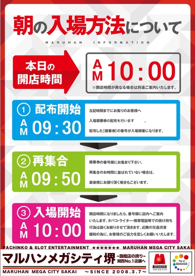 9時30分迄にお並びいただいたお客様に入場抽選にて順番券を配布致します。※新台入替予定日など時間が変動する場合がございます。 |