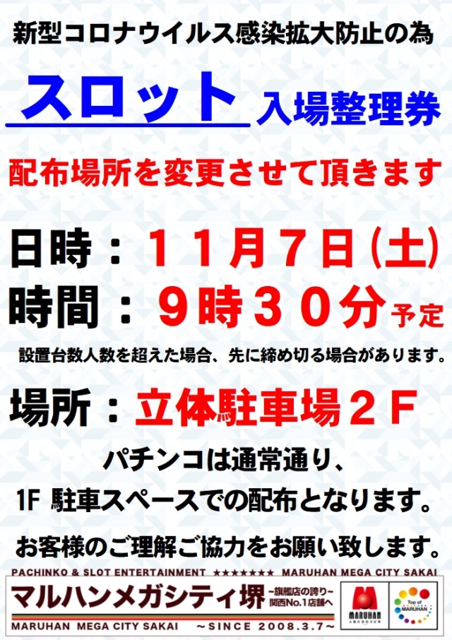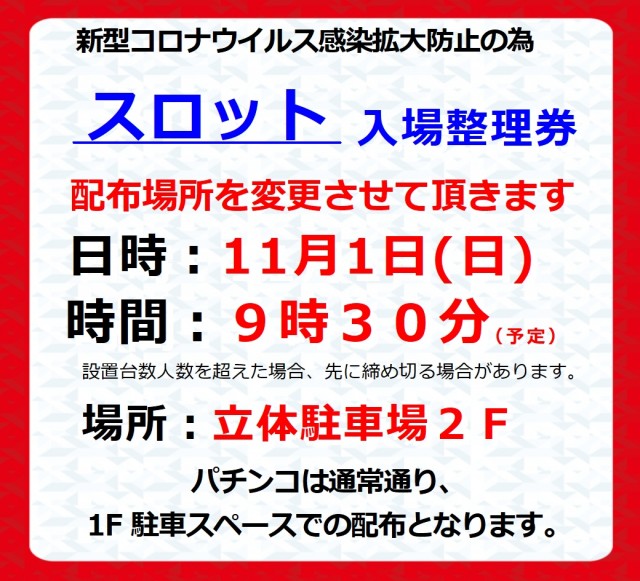 9時30分迄にお並びいただいたお客様に入場抽選にて順番券を配布致します。※新台入替予定日など時間が変動する場合がございます。 |