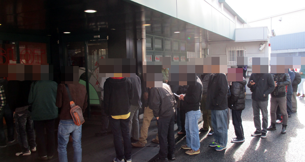 取材日は雪が降っていたにもかかわらず、開店前から100名以上が集まる盛況ぶり。防寒対策として、スタッフがジェットヒーターを設置しているだけでなく、お茶やホットコーヒーを配布していたことも印象的であった。