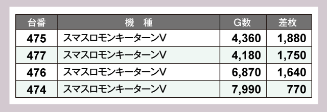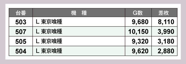 そのほかにも数多くの機種でハイスコアを記録。終日高稼働を記録した『L 東京喰種』では、+8,000オーバーを筆頭に4台がプラス差枚を達成。『スマスロモンキーターンV』や『ゴーゴージャグラー3』始め多くのシマでも好調台が見られ、店内随所で活気が感じられた。