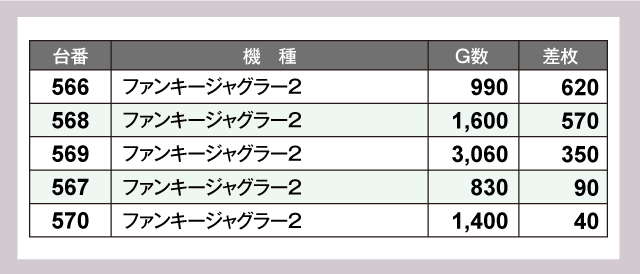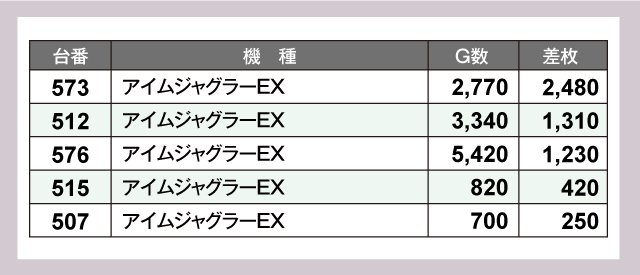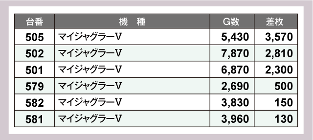 まずはパチスロをチェックしてみると、人気のジャグラーシリーズを中心に好調台を多数確認、特に『マイジャグラーV』が+3,000枚超に+2,000枚超が2台という見事な結果を残している。