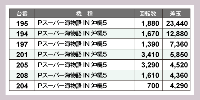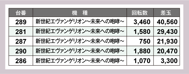 また、パチンココーナーでは『新世紀エヴァンゲリオン〜未来への咆哮〜』で+40,560発、『Pスーパー海物語 IN 沖縄5』で+23,440発と定番の人気機種の活躍が目立っていた。