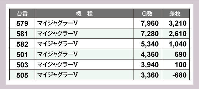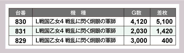 まずはパチスロをチェックしてみると、『スマスロモンキーターンV』から+5,420枚に+3,670枚と全3台中2台が好成績を記録。さらに、『L戦国乙女4 戦乱に閃く炯眼の軍師』では全台がプラス差枚で終了、そのうちの1台が+5,100枚という見事な結果を残している。