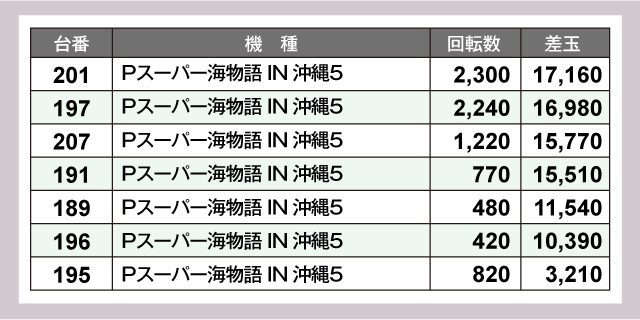 一方、パチンココーナーでは『Pスーパー海物語 IN 沖縄5』から+10,000発超の台が大量発生!! なかでも201番台が圧巻の+17,160発を叩き出しているだけに、シマ内は常に活気に包まれていた。