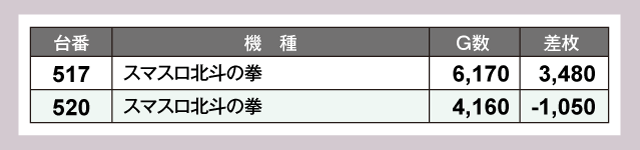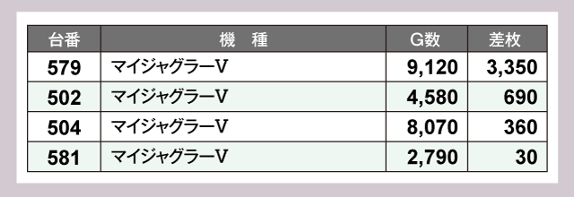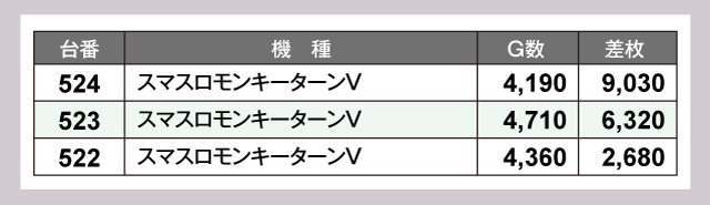 そのほかの機種からも、『マイジャグラーⅤ』で+3,350枚、『スマスロ北斗の拳』で+3,480枚と差枚+3,000枚を超えるマシンが飛び出し店内を盛り上げていた。