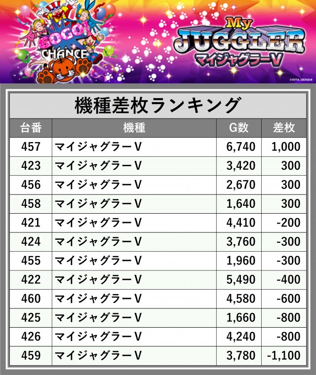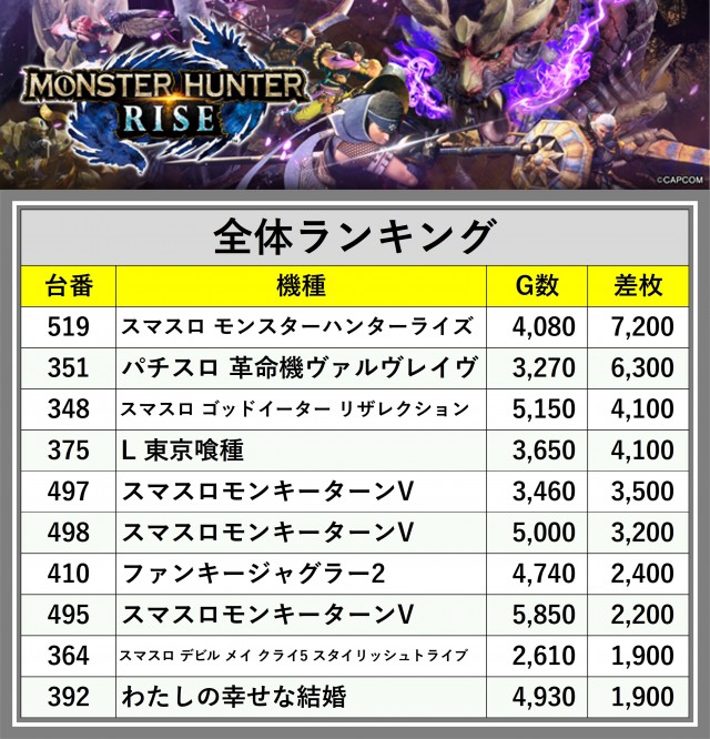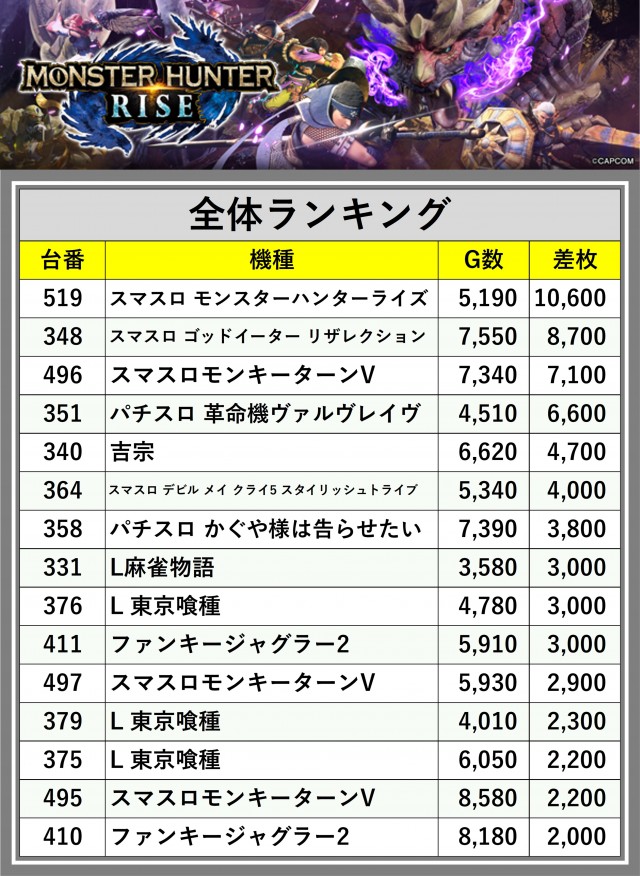 厳選された取材対象機種をはじめ、その他スロット全体から好記録が飛び出した!プレイヤーが楽しんだ1日を下記データにて振り返ってみて欲しい。